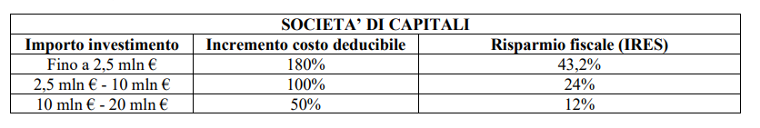ENTITA’ DELLE AGEVOLAZIONI L’agevolazione consiste in un incremento del costo fiscalmente deducibile ai fini IRES/IRPEF, come riportato nella tabella seguente:
